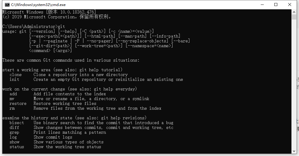 在Windows上安装Git,可以从Git官网下载,一路默认下去就好了,安装完成后按键盘的win+R,输入cmd,弹出命令符见面再输入git,出现如下命令则安装成功: