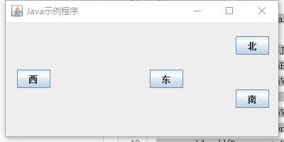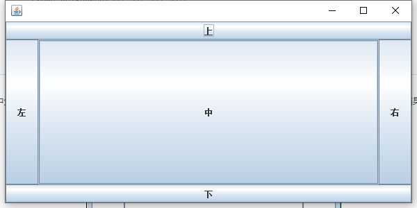 | class Test0901{ public static void main(String[] args) { JFrame jf = new JFrame(); jf.setSize(400,200); jf.setLayout(new BorderLayout()); JButton button1 = new JButton("上"); JButton button2 = new JButton("左"); JButton button3 = new JButton("中"); JButton button4 = new JButton("右"); JButton button5 = new JButton("下"); jf.add(button1,BorderLayout.NORTH); jf.add(button2,BorderLayout.WEST); jf.add(button3,BorderLayout.CENTER); jf.add(button4,BorderLayout.EAST); jf.add(button5,BorderLayout.SOUTH); jf.setBounds(300,200,600,300); jf.setDefaultCloseOperation(JFrame.EXIT_ON_CLOSE); jf.setVisible(true);