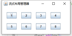 上述代码中想JPanel面板中添加了9个按钮,但如果面板打下不允许的情况的按钮不会显示完全,同时会自动换行。