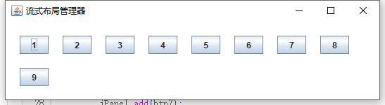 | class Test0902{ public static void main(String[] args) { JFrame jf = new JFrame("流式布局管理器"); JPanel jPanel = new JPanel(); JButton button1 = new JButton("1"); JButton button2 = new JButton("2"); JButton button3 = new JButton("3"); JButton button4 = new JButton("4"); JButton button5 = new JButton("5"); JButton button6 = new JButton("6"); JButton button7 = new JButton("7"); JButton button8 = new JButton("8"); JButton button9 = new JButton("9"); jPanel.add(button1); jPanel.add(button2); jPanel.add(button3); jPanel.add(button4); jPanel.add(button5); jPanel.add(button6); jPanel.add(button7); jPanel.add(button8); jPanel.add(button9); jPanel.setLayout(new FlowLayout(FlowLayout.LEADING,20,20)); jPanel.setBackground(Color.white); jf.add(jPanel); jf.setBounds(300,200,300,150); jf.setVisible(true); jf.setDefaultCloseOperation(JFrame.EXIT_ON_CLOSE); } }