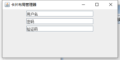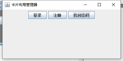 public class CardLayoutDemo { public static void main(String[] args) { JFrame jf = new JFrame("卡片布局管理器"); JPanel jp1 = new JPanel(); JPanel jp2 = new JPanel(); JPanel cards = new JPanel(new CardLayout()); jp1.add(new JButton("登录")); jp1.add(new JButton("注册")); jp1.add(new JButton("找回密码")); jp2.add(new JTextField("用户名"),20); jp2.add(new JTextField("密码"),20); jp2.add(new JTextField("验证码",20)); cards.add(jp1, "card1"); cards.add(jp2, "card2"); CardLayout c1 = (CardLayout) cards.getLayout(); c1.show(cards,"card1"); jf.add(cards); jf.setBounds(300,200,400,200); jf.setVisible(true); jf.setDefaultCloseOperation(JFrame.EXIT_ON_CLOSE); } }