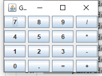 | class GridLayoutDemo { public static void main(String[] args) { JFrame frame = new JFrame("GridLayou布局计算器"); JPanel panel = new JPanel(); panel.setLayout(new GridLayout(4, 4, 5, 5)); panel.add(new JButton("7")); panel.add(new JButton("8")); panel.add(new JButton("9")); panel.add(new JButton("/")); panel.add(new JButton("4")); panel.add(new JButton("5")); panel.add(new JButton("6")); panel.add(new JButton("*")); panel.add(new JButton("1")); panel.add(new JButton("2")); panel.add(new JButton("3")); panel.add(new JButton("-")); panel.add(new JButton("0")); panel.add(new JButton(".")); panel.add(new JButton("=")); panel.add(new JButton("+")); frame.add(panel); frame.setBounds(300, 200, 200, 150); frame.setVisible(true); frame.setDefaultCloseOperation(JFrame.EXIT_ON_CLOSE); } }