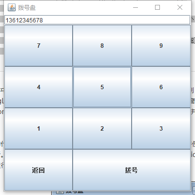 | class GridBagLayoutDemo { public static void makeButton(String title,JFrame frame,GridBagLayout gridBagLayout,GridBagConstraints constraints) { JButton button=new JButton(title); gridBagLayout.setConstraints(button,constraints); frame.add(button); } public static void main(String[] agrs) { JFrame frame=new JFrame("拨号盘"); GridBagLayout gbaglayout=new GridBagLayout(); GridBagConstraints constraints=new GridBagConstraints(); frame.setLayout(gbaglayout); constraints.fill=GridBagConstraints.BOTH; constraints.weightx=0.0; constraints.gridwidth = GridBagConstraints.REMAINDER; JTextField tf=new JTextField("13612345678"); gbaglayout.setConstraints(tf, constraints); frame.add(tf); constraints.weightx=0.5; constraints.weighty=0.2; constraints.gridwidth=1; makeButton("7",frame,gbaglayout,constraints); makeButton("8",frame,gbaglayout,constraints); constraints.gridwidth=GridBagConstraints.REMAINDER; makeButton("9",frame,gbaglayout,constraints); constraints.gridwidth=1; makeButton("4",frame,gbaglayout,constraints); makeButton("5",frame,gbaglayout,constraints); constraints.gridwidth=GridBagConstraints.REMAINDER; makeButton("6",frame,gbaglayout,constraints); constraints.gridwidth=1; makeButton("1",frame,gbaglayout,constraints); makeButton("2",frame,gbaglayout,constraints); constraints.gridwidth=GridBagConstraints.REMAINDER; makeButton("3",frame,gbaglayout,constraints); constraints.gridwidth=1; makeButton("返回",frame,gbaglayout,constraints); constraints.gridwidth=GridBagConstraints.REMAINDER; makeButton("拨号",frame,gbaglayout,constraints); constraints.gridwidth=1; frame.setBounds(400,400,400,400); frame.setVisible(true); frame.setDefaultCloseOperation(JFrame.EXIT_ON_CLOSE); } }