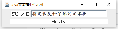 | class JTextFieldDemo { public static void main(String[] agrs) { JFrame frame = new JFrame("Java文本框组件示例"); JPanel jp = new JPanel(); JTextField txtfield1 = new JTextField(); txtfield1.setText("普通文本框"); JTextField txtfield2 = new JTextField(28); txtfield2.setFont(new Font("楷体", Font.BOLD, 16)); txtfield2.setText("指定长度和字体的文本框"); JTextField txtfield3 = new JTextField(30); txtfield3.setText("居中对齐"); txtfield3.setHorizontalAlignment(JTextField.CENTER); jp.add(txtfield1); jp.add(txtfield2); jp.add(txtfield3); frame.add(jp); frame.setBounds(300, 200, 400, 100); frame.setVisible(true); frame.setDefaultCloseOperation(JFrame.EXIT_ON_CLOSE); } }