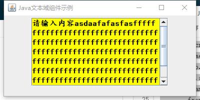 | class JTextAreaDemo { public static void main(String[] agrs) { JFrame frame = new JFrame("Java文本域组件示例"); JPanel jp = new JPanel(); JTextArea jta = new JTextArea("请输入内容", 7, 30); jta.setLineWrap(true); jta.setForeground(Color.BLACK); jta.setFont(new Font("楷体", Font.BOLD, 16)); jta.setBackground(Color.YELLOW); JScrollPane jsp = new JScrollPane(jta); Dimension size = jta.getPreferredSize(); jsp.setBounds(110, 90, size.width, size.height); jp.add(jsp); frame.add(jp); frame.setBackground(Color.LIGHT_GRAY); frame.setSize(400, 200); frame.setVisible(true); } }
